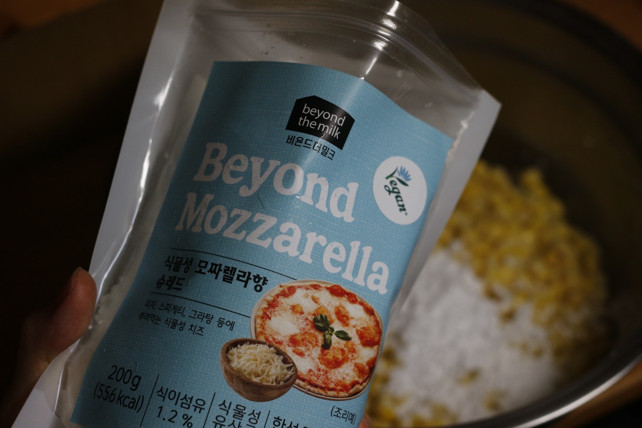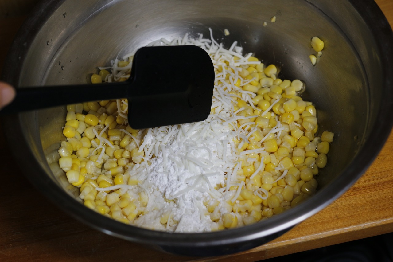옥수수를 넣은 볼에 감자전분 적당량과 비건치즈를 뿌린다.