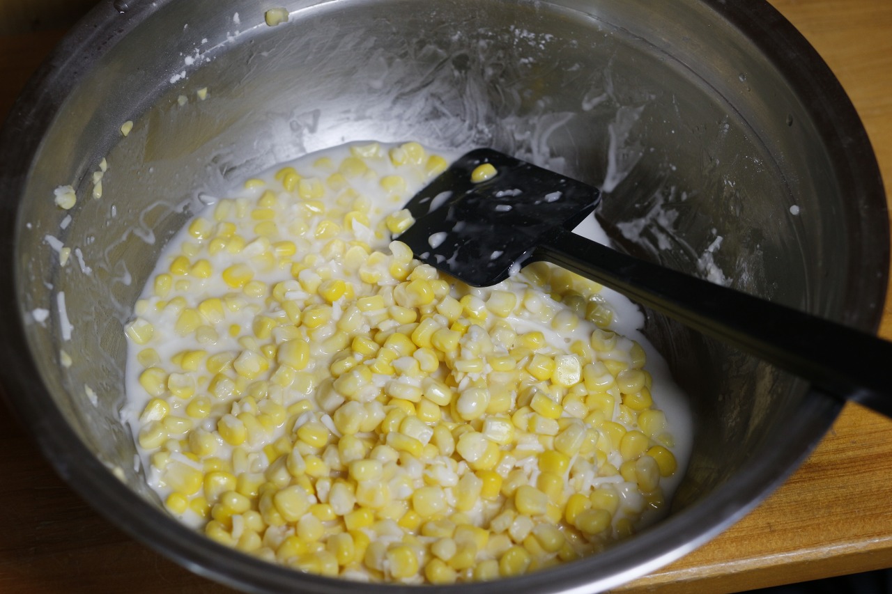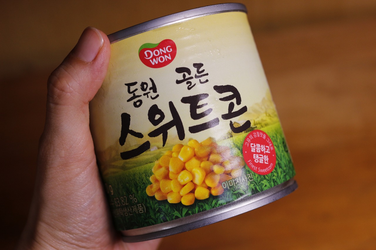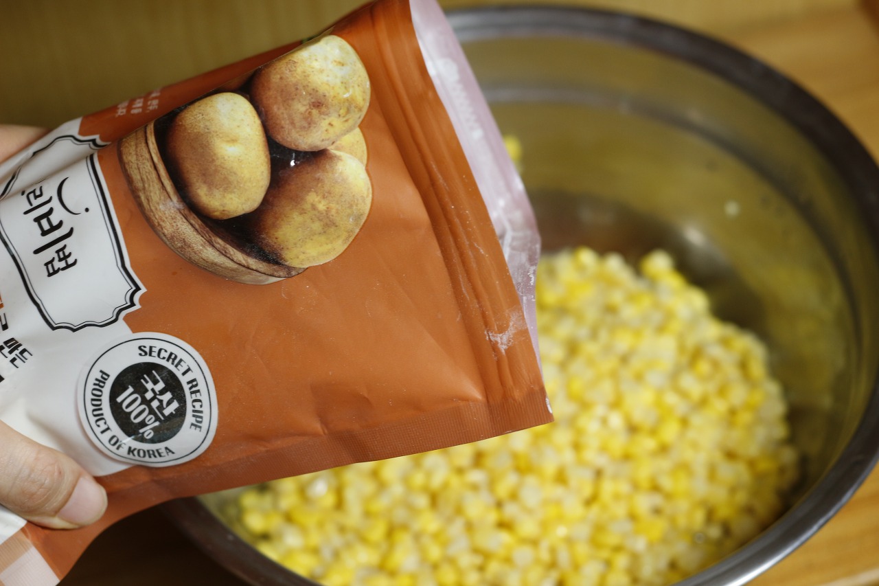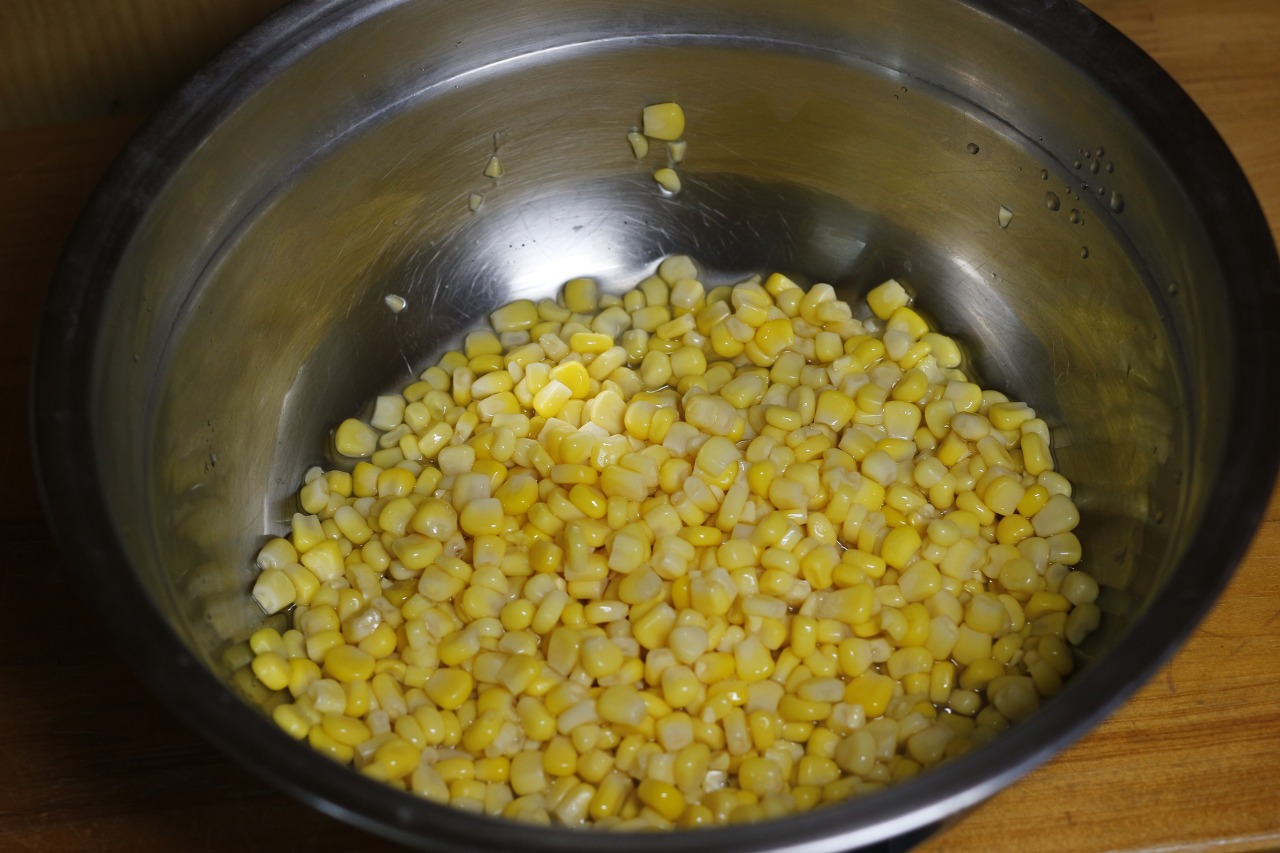 옥수수 통조림을 따서 볼에 부어버린다. 보통은 체에 걸러 옥수수와 물기를 분리하는데 어차피 물을 조금 섞어야 하는 거라서 수분과 옥수수 알갱이를 따로 분리하지 않았다.
