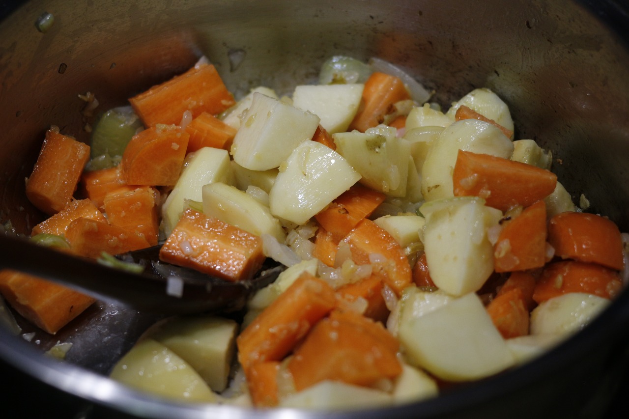 양파가 어느 정도 볶아지면 마늘을 넣고, 바로 당근과 감자를 냄비에 부어버린다. 안 그러면 마늘이 타더라. 나는 간마늘을 넣어서 바로 당근과 감자를 넣지 않으면 마늘이 탔는데 통마늘을 사용한 사람이라면 굳이 그러지 않아도 된다.
