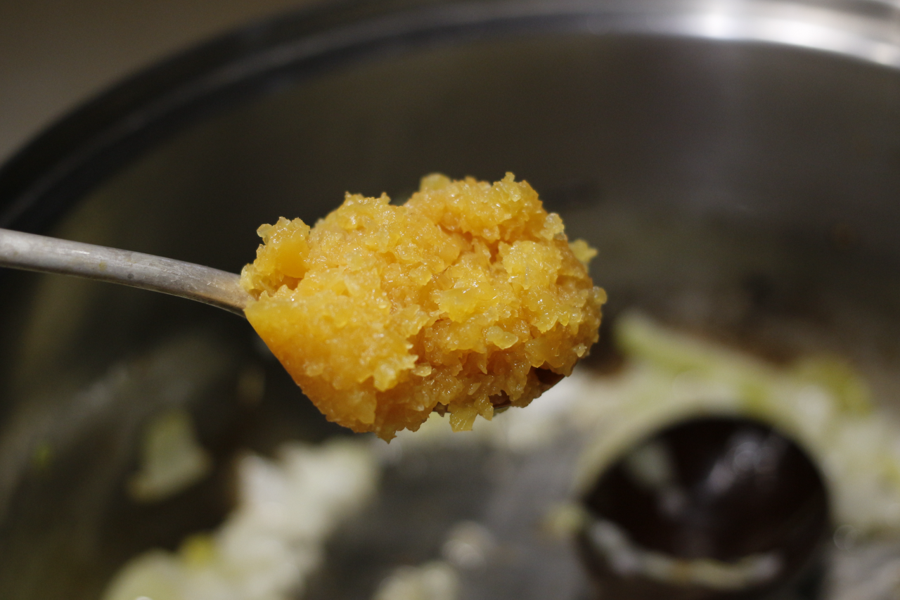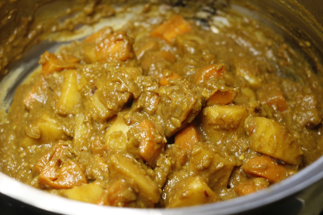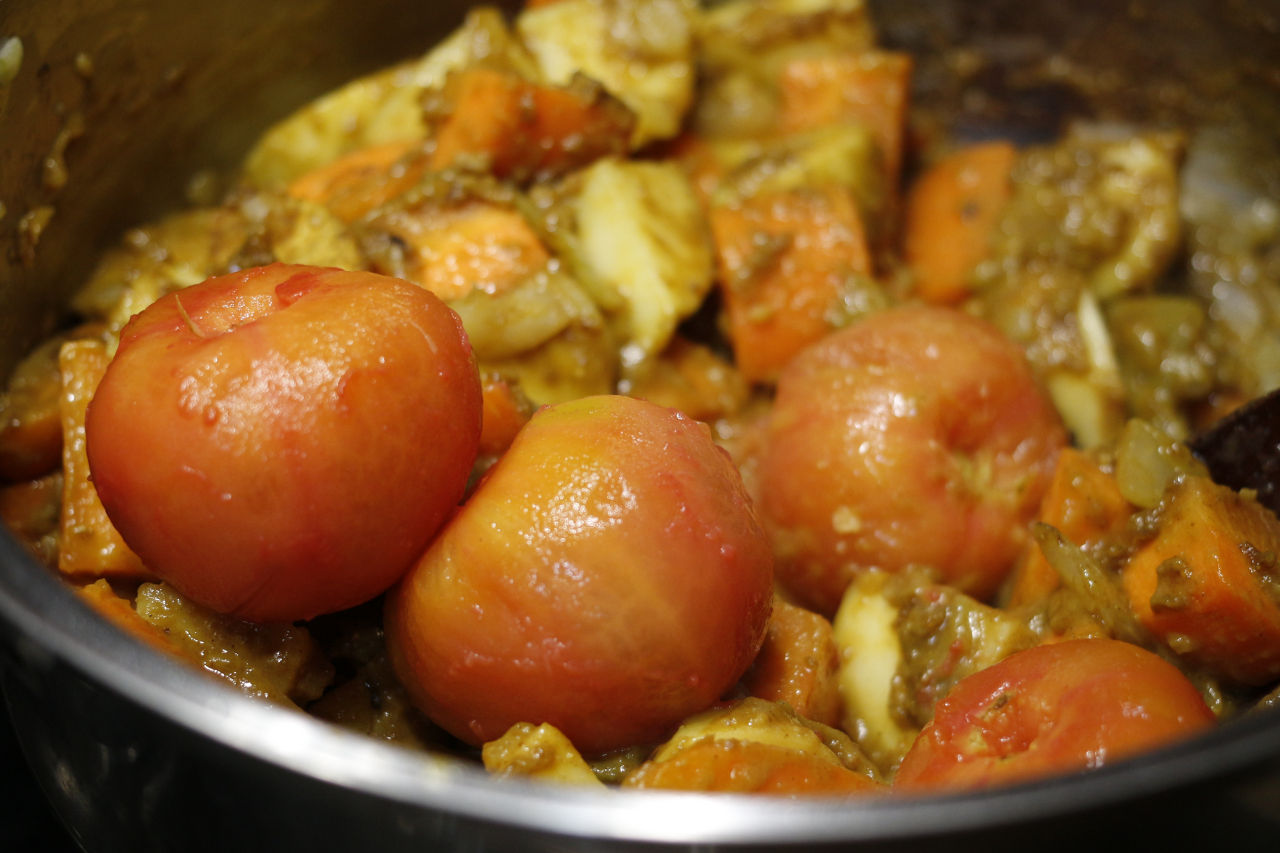 카레가루, 당근, 감자, 양파가 어느 정도 섞으면 껍질을 벗긴 토마토를 넣어서 으깨준다. 어차피 오래오래 끓여서 먹을 카레이기 때문에 아쉬워 하지 말고 가차없이 토마토를 으깨기를 바란다. 이래야지 토마토에서 나온 수분 덕분에 요리가 타지 않는다.