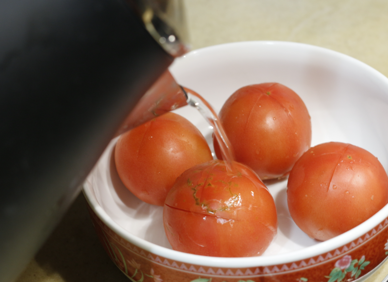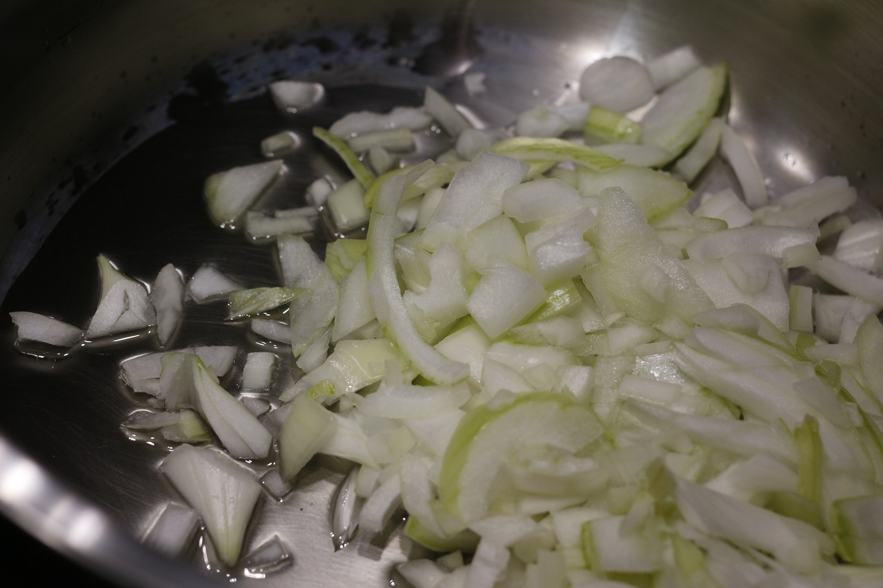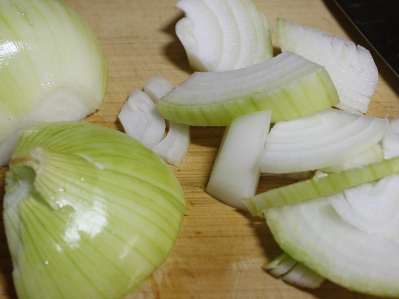 당근, 양파, 감자를 다 자른 뒤 냄비에 기름을 넣은 뒤 양파를 볶는다. 양파를 볶는 사이에 뜨거운 물에 넣어져 있던 토마토를 꺼내 껍질을 벗겨야 한다. 사실 껍질을 넣어도 상관은 없지만 보다 부드러운 식감을 위해서 껍질을 벗기는 것이다.