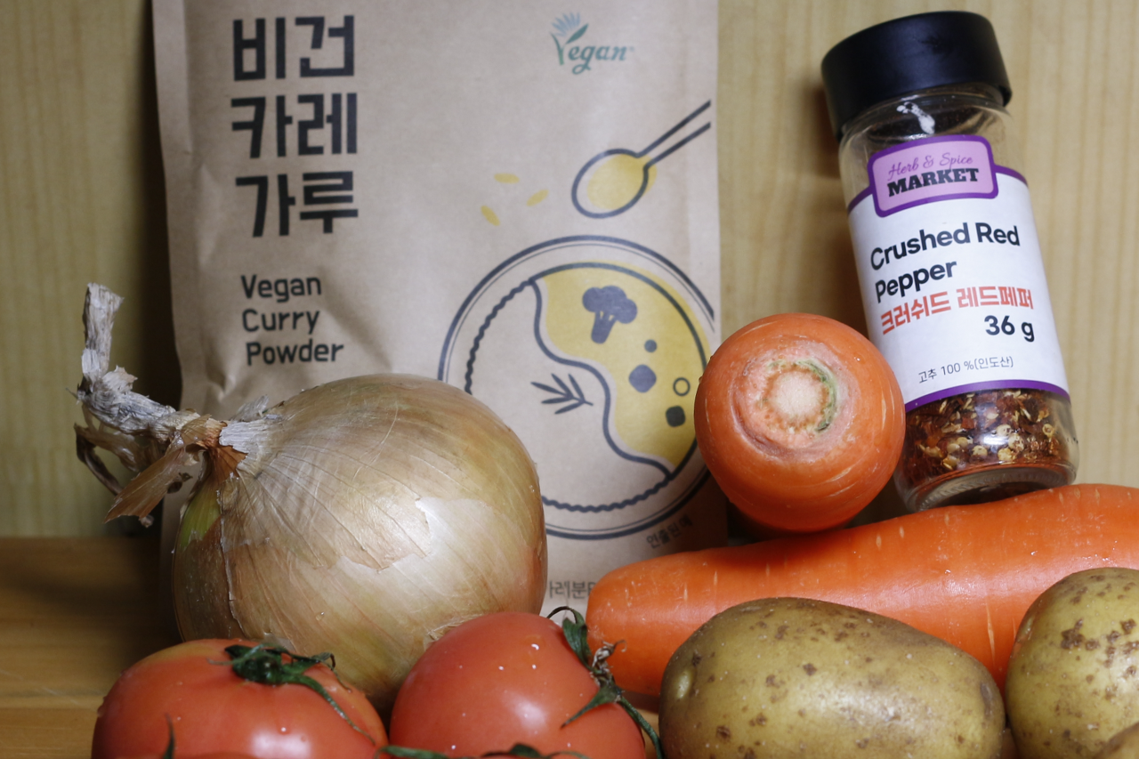 비건 카레의 재료 중 가장 중요한 것은 비건 카레 가루가 아닐까 싶다. 시중에서 파는 카레에는 우유나 고기가 들어가기 마련이므로 인터넷에서 비건 카레 가루를 검색하여 주문하기를 바란다. 카레 가루가 집에 도착하고 난 뒤 집 앞에 있는 마트에서 감자와 함께 당근, 토마토, 양파를 구매했고 집에 있는 크러쉬드 레드페퍼를 꺼내두었다.