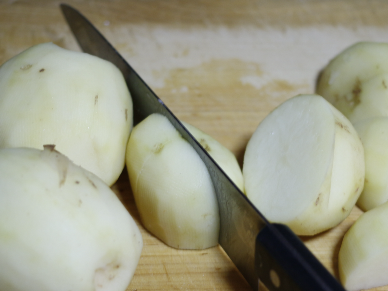 뜨거운 물에 토마토를 담고 있는 사이에 감자, 당근, 양파를 깨끗이 씻은 뒤에 잘라주면 된다. 양파는 잘게 썰면 되고 당근과 감자는 대애충 큼지막하게 썰어도 된다. 어차피 오래오래 익히면 되니까 굳이 양파와 당근은 작게 자르려고 노력하지 않아도 된다.