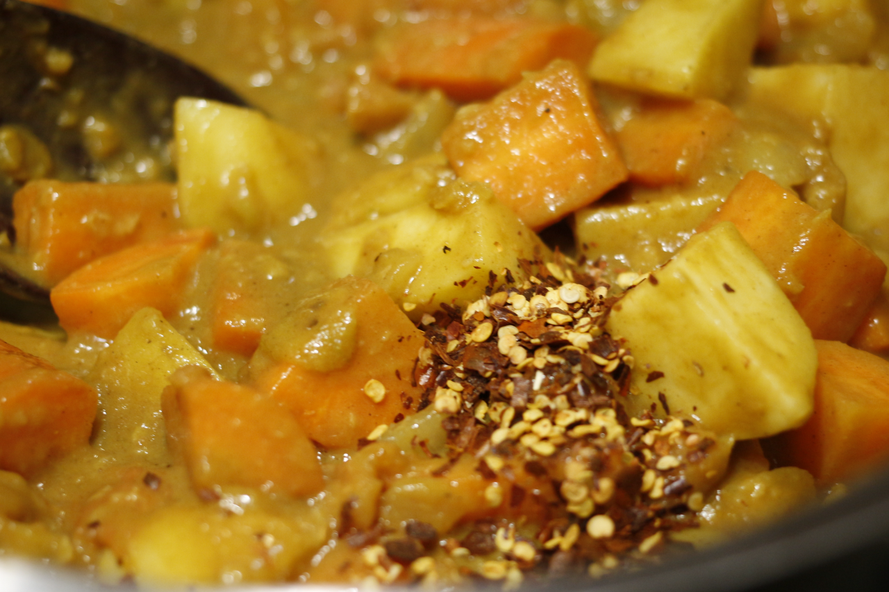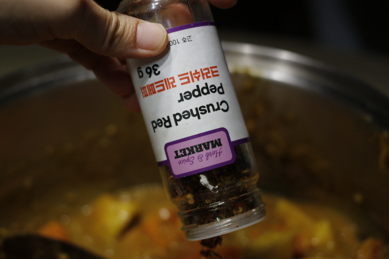 약불로 계속 카레를 끓이다가 크러쉬드 레드 페퍼를 넣는다. 집에 크러쉬드 레드페퍼가 없으면 그냥 고추가루를 넣어도 되고 매운 음식이 싫으면 아예 넣지 않아도 상관 없다. 조금 부드러운 맛을 원한다면 코코넛 밀크를 넣으면 된다.
