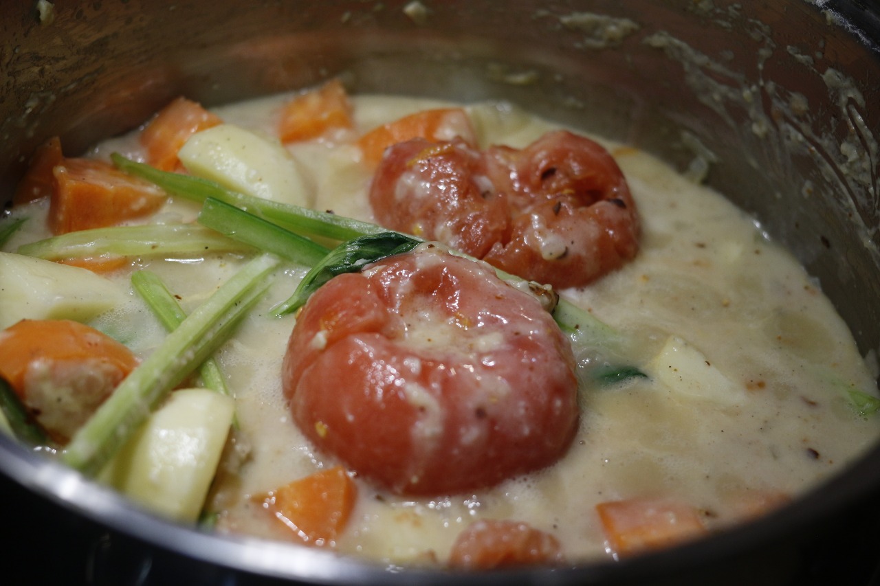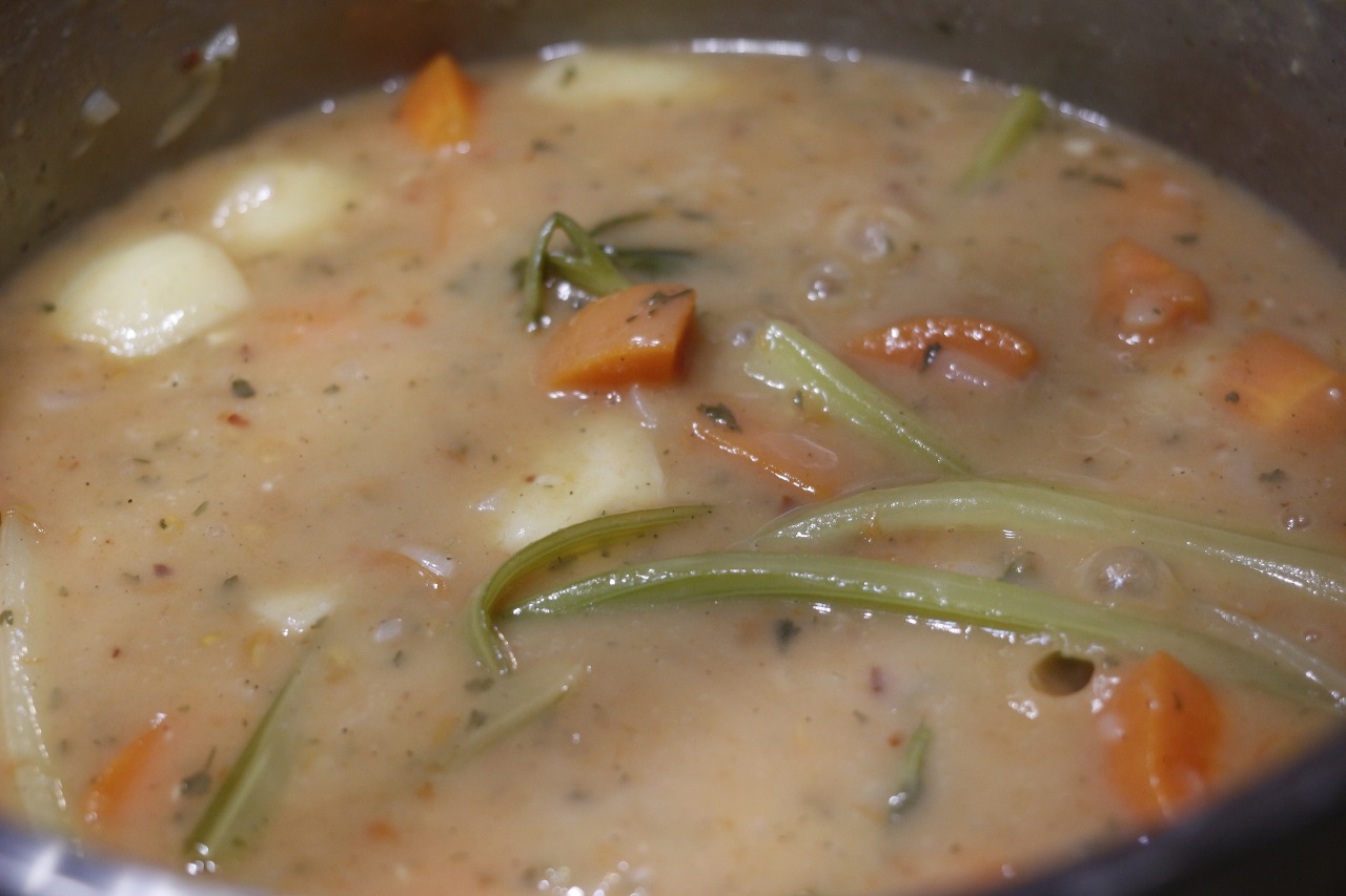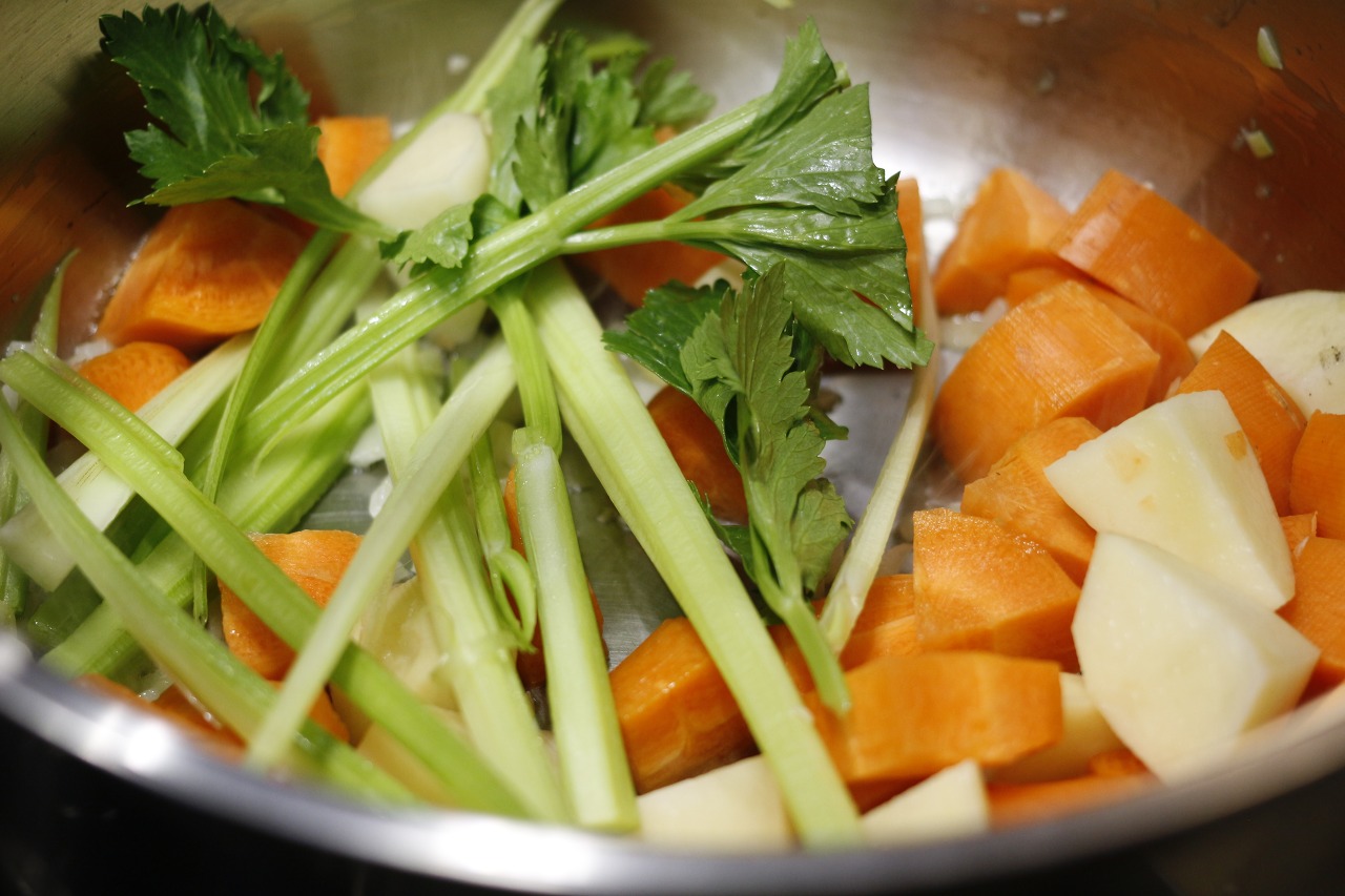 재료 손질이 다 끝났으면 냄비에 올리브 오일을 두른 뒤, 양파, 감자, 당근, 샐러리를 넣은 뒤 익히기를 바란다. 양파를 제일 먼저 넣고 어느 정도 익은 후에 당근과 감자와 샐러리를 넣으라고 '구글에서 알려준 레시피'가 그랬다.
