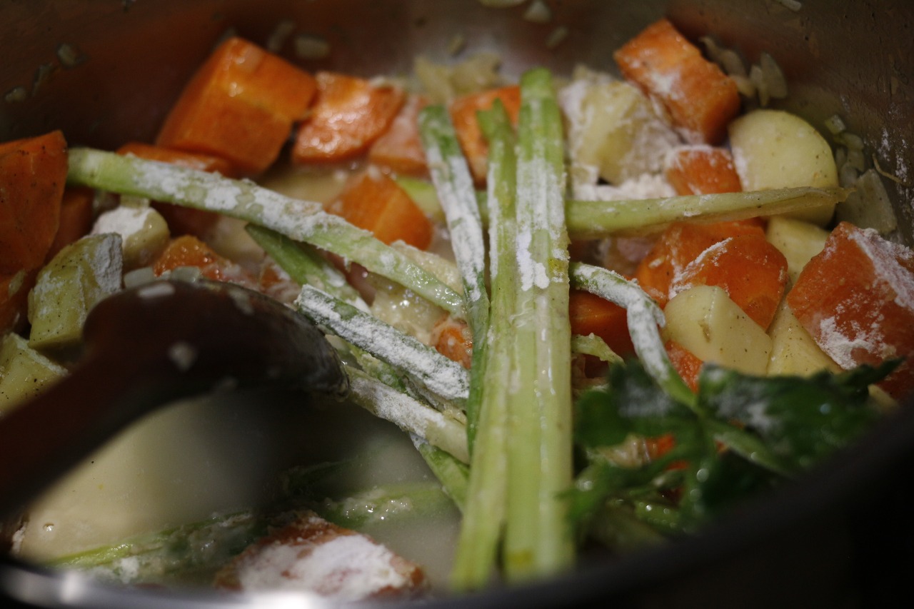 스튜가 익어가는 과정인데 내가 만든 음식이지만 정말 맛이 없게 생겼구나. 1년이 넘는 시간동안 글을 쓰기 위해 강제로 요리를 하여도 요리를 예쁘게 만드는 실력이 안 되는 것은 내 탓이겠지? 그나마 먹을 수 있는 음식이 만들어진다는 것이 대단하다 싶다. 스튜를 약불로 끓이면서 계속해서 저어주어야 한다. 당근과 감자가 익는동안 스튜를 젓기 않는다면 밀가루 때문에 냄비 바닥이 모두 타 버린다. 식초는 스튜 속에 있는 당근과 감자가 어느 정도 익었을 때 넣고 맛을 본다. 너무 많이 넣지 않기를 바란다.