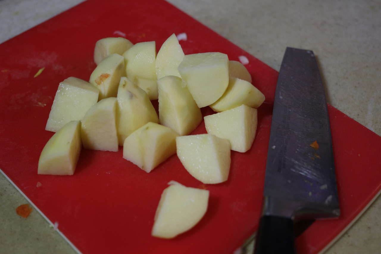 채소를 깨끗이 씼었다면 양파는 잘게 썰어주고 당근과 감자는 크게크게 깍뚝썰기로 잘라준다. 굳이 당근과 감자를 크게 썬 이유는 칼질을 하는 것이 엄청나게 귀찮았기 때문이 맞다.