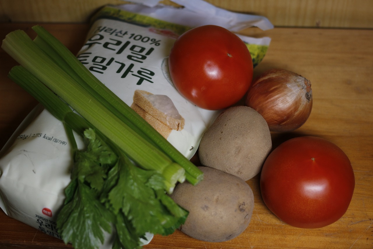 레시피를 찾아보니 밀가루, 샐러리, 감자, 토마토, 양파도 들어가길래 집 앞에 있는 마트에서 식재료를 공수해왔다. 로즈마리, 백리향, 세이지를 다져서 만든 허브도 넣으라고 했는데 이건 집에도 없고 구하는 것도 귀찮아서 그냥 안 넣었다. 혹시 집에 이런 허브가 있으면 넣기를 바란다.