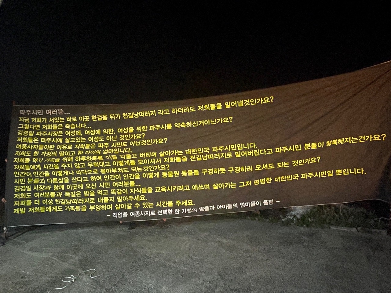 2023년 4월 지금도, 파주의 용주골 집결지에서 생존권을 잃지 않기 위한 싸움이 계속되고 있다. 시에서 밀어버리려는 연풍리 집결지를 노동자들은 일할 수 있고, 삶을 이어나갈 수 있게 해준 집결지를 ‘안전지대’라고 부르고 있으며, 강경하게 일자리를 지키기 위해서 싸움을 이어나가고 있다.