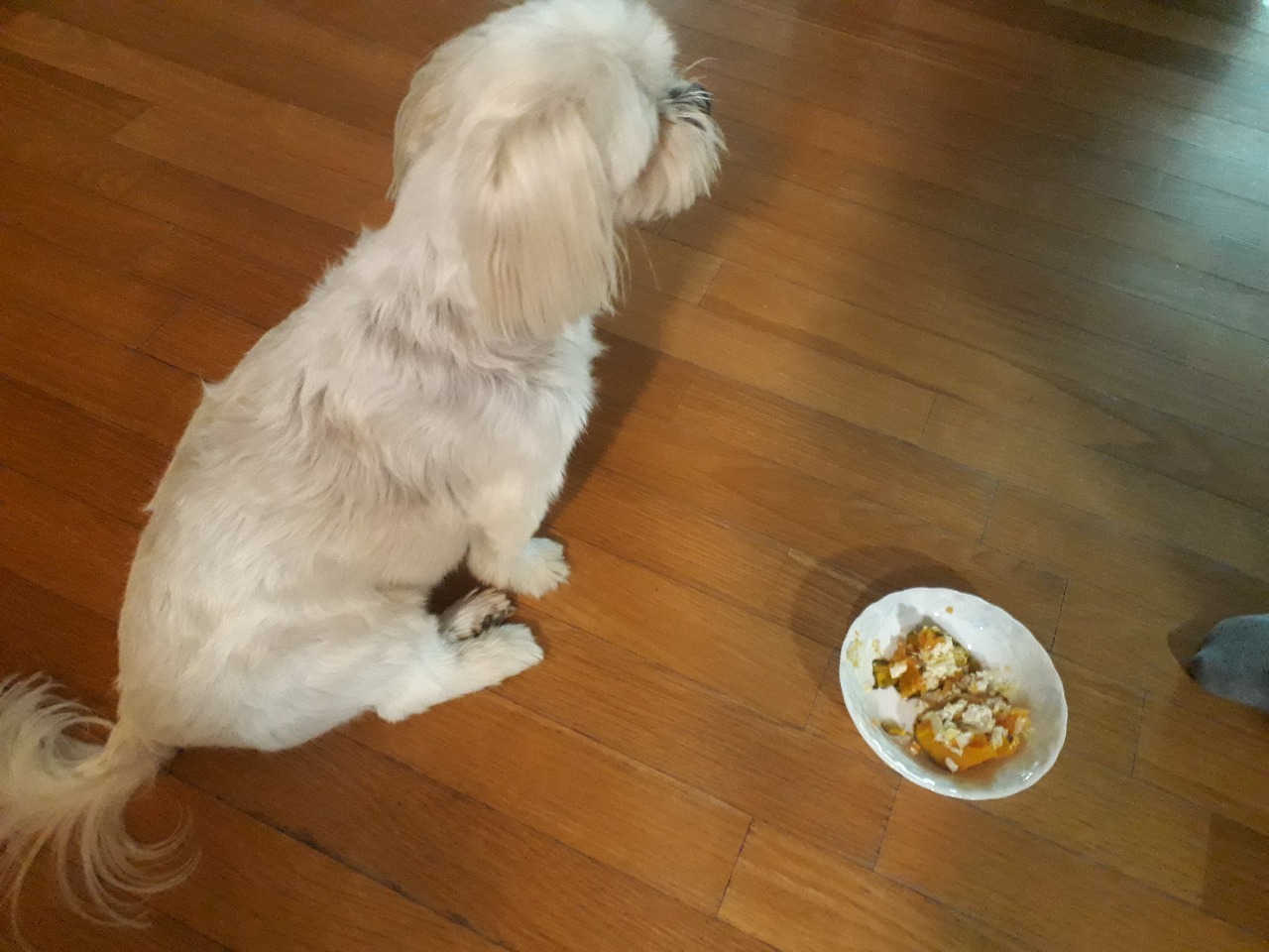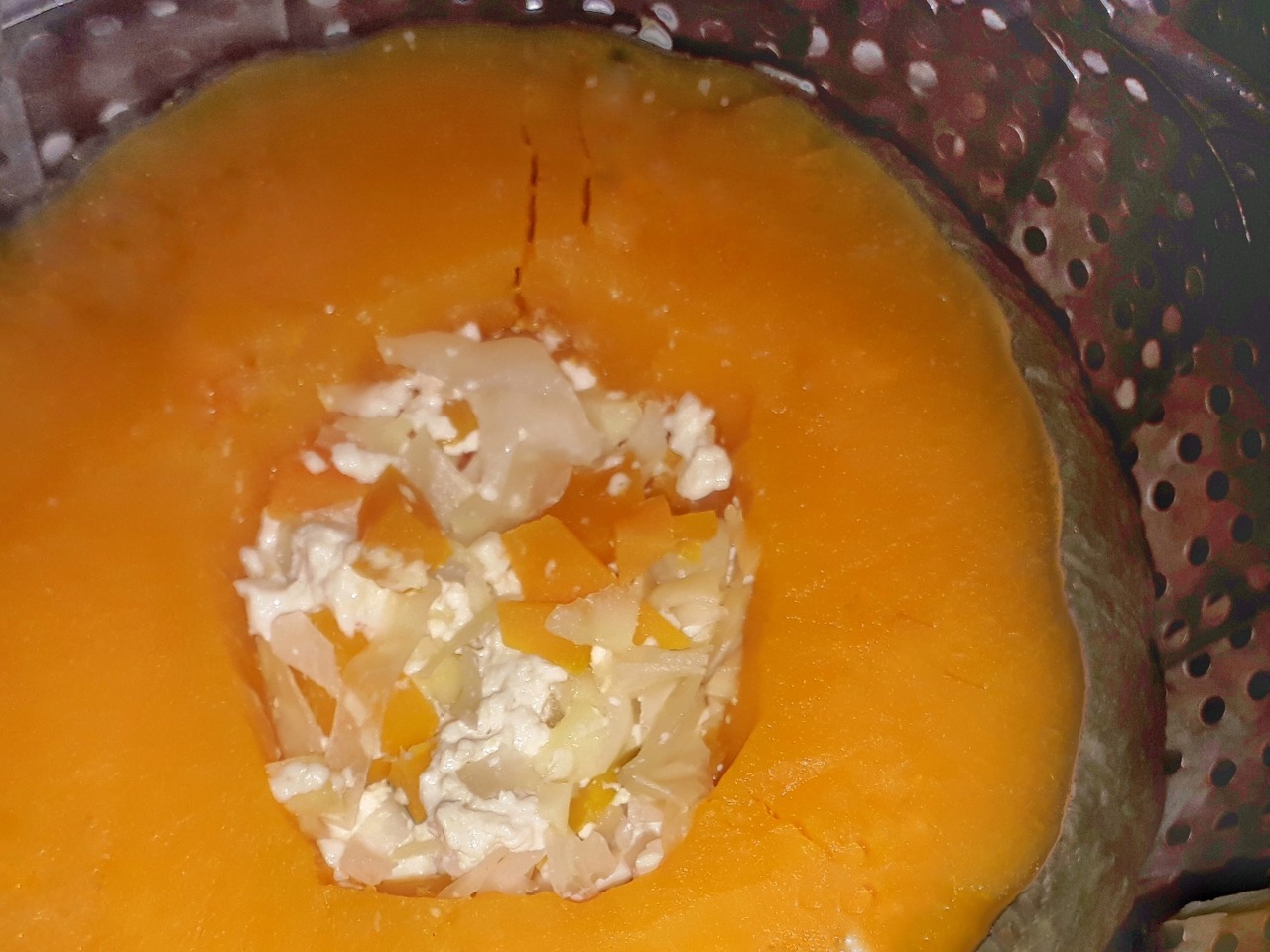 준비된 재료는 속을 비운 단호박 안에 채워 넣고 찜기로 쪄야한다. 어느 레시피에서는 30분 정도 걸린다고 하였는데, 그냥 익을 때까지 찐다. 참고로 냄비에는 물을 적당량 붓고 찜기를 올린 후 불을 켜야 한다. 냄비에 물을 붓지 않으면 온 집안에 불에 탈 수가 있다. 반려동물 간식을 만들다가 집에 불을 내지 않고 안전사고에 조심하면서 요리를 해야 한다.