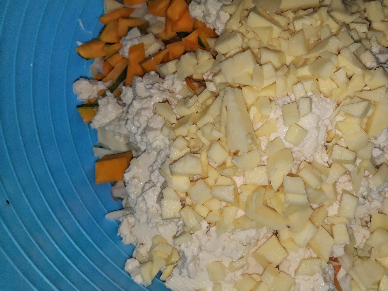 고구마, 당근, 양배추는 적당량 준비한다. 너무 많이 준비하면 모둔 재료가 단호박 내부에 들어갈 수 없다. 남은 음식을 인간 동물이 모두 섞어서 먹을 것이 아니면 알아서 잘 계량하기를 바란다. 양배추, 당근, 고구마는 잘게 썰어준다.