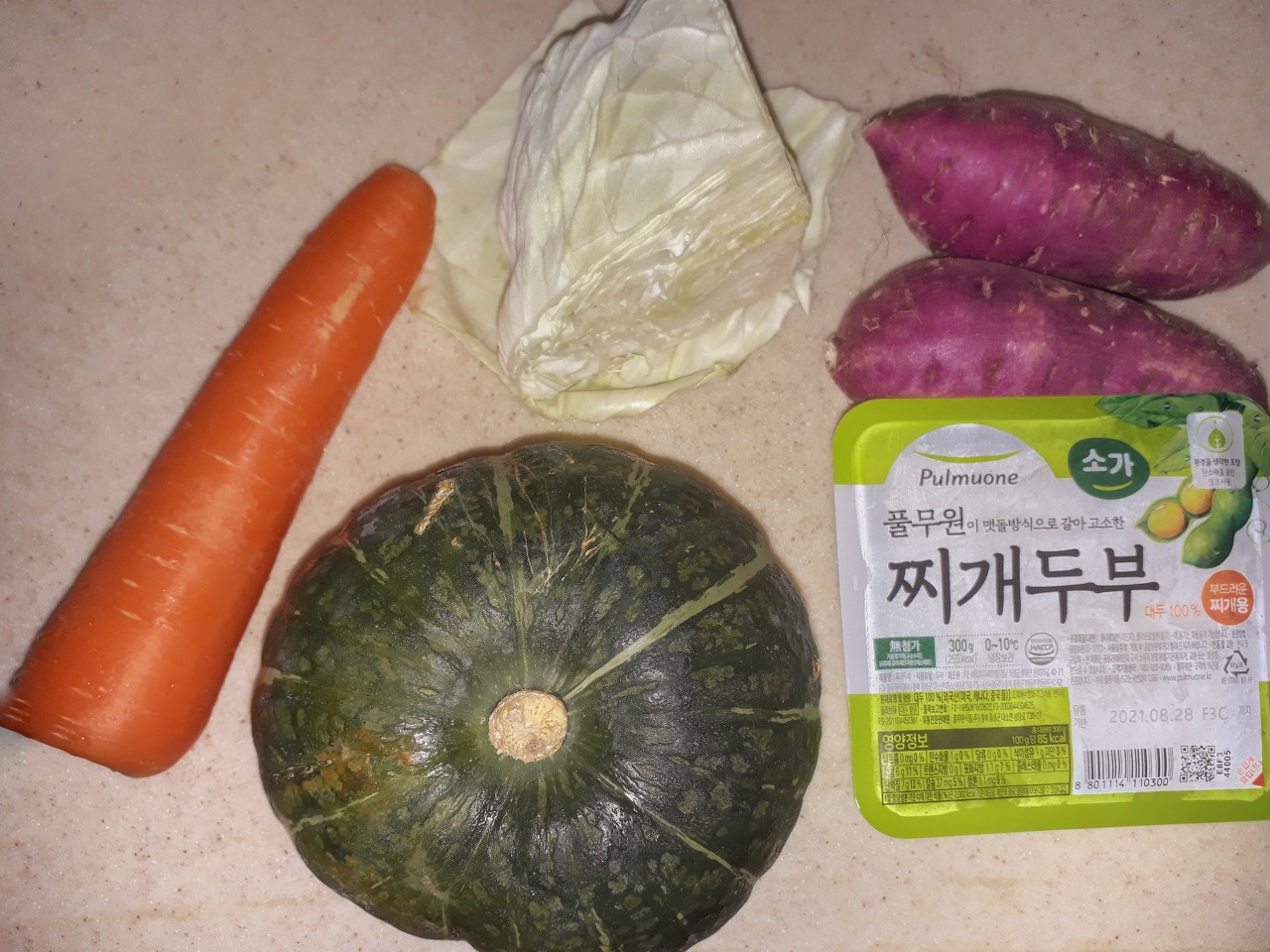 준비물은 단호박, 당근, 고구마, 두부, 양배추이다. 개도 먹을 수 있고 인간 동물도 먹을 수 있는 재료로 준비를 해보았다. 단호박에는 각종 비타민, 미네랄, 섬유질이 함유되어 있으며, 식이섬유가 풍부하여 소화를 촉진시켜주는 기능이 있다.양배추 역시 미네랄과 비타민이 풍부하고 반려견의 피부건강과 혈관을 튼튼하게 하고 위장질환 예방에 효과가 있다. 당근에는 비타민A의 전구체인 카로틴이 풍부하여 노화예방, 눈 건강, 피부예방에 효과가 있다. 여기에 단맛이 나서 반려견에게 많이 급여하는 고구마와 단백질 섭취를 위한 두부도 준비하였다. 육식성 단백질을 배제한 이유는 반려견의 건강 때문이다. 개의 경우 육식성 단백질을 과다 섭취할 경우 췌장, 신장 질환이 생길 위험이 있어 장기능이 원활하지 않거나 노령견의 건강의 위험요소가 될 수 있다. 이 세상의 모든 비인간 동물과 반려견의 건강을 위한 선택이니 알아주길 바란다.