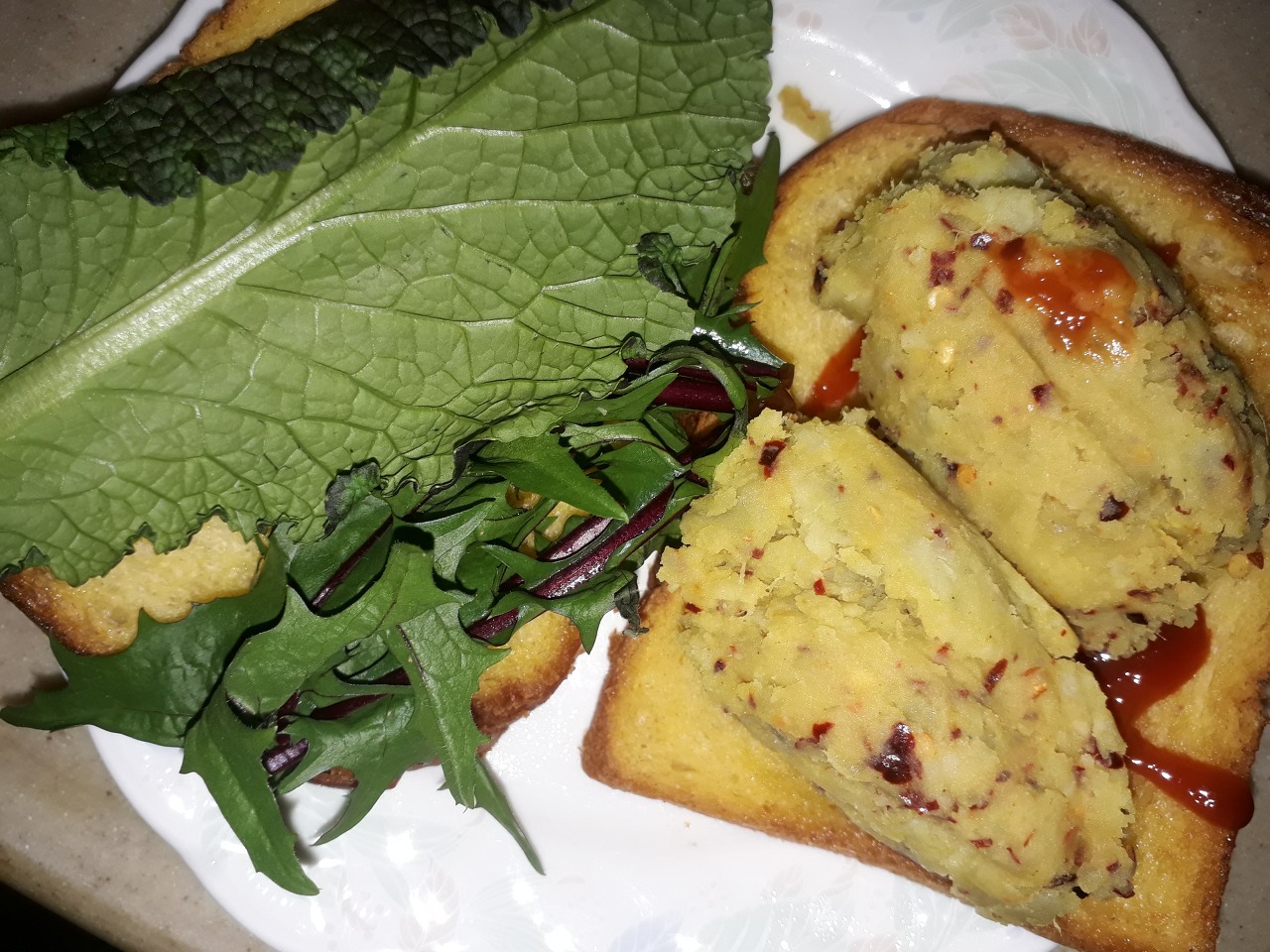 빵이 노릇노릇하게 구원지면 빵위에 겨자채와 적치커리를 올리고 소스를 바른 후 고구마를 올려서 샌드위치를 만들어 먹는다. 취향에 따라 오픈샌드위치를 만들어 먹어도 되고 그냥 일반적인 샌드위치를 만들어 먹어도 된다.