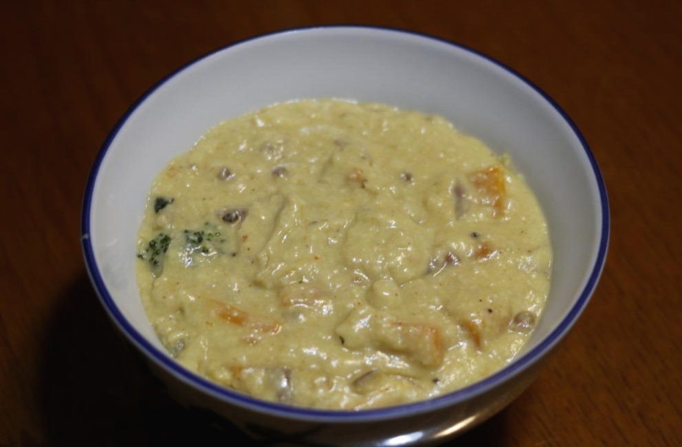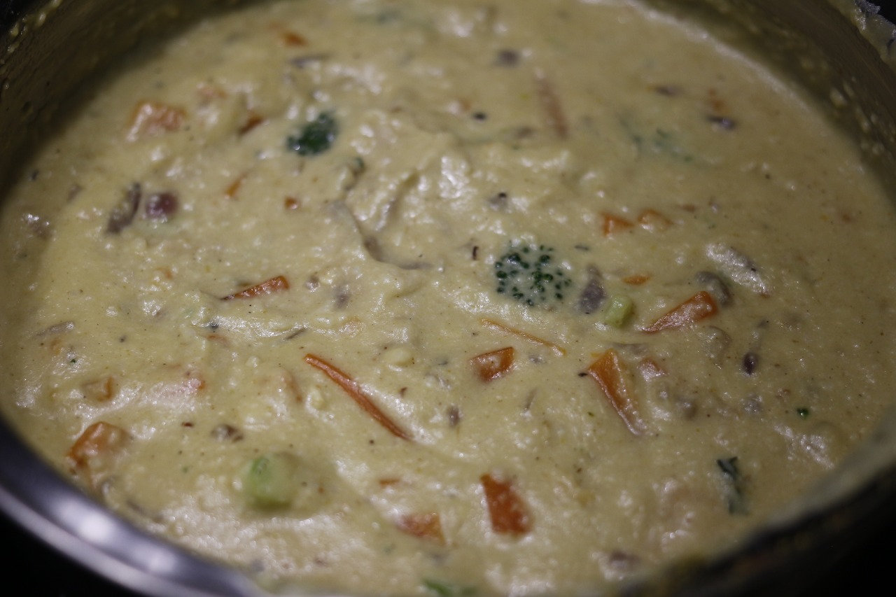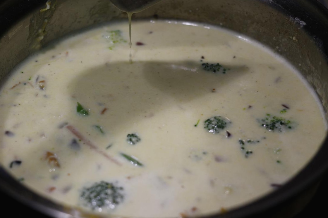 양파와 당근이 어느정도 익었다 싶으면 브로콜리를 넣고 후추와 소금으로 간을 한 뒤 5분 정도 더 익히기를 바란다. 어차피 채수와 캐슈넛 간 것을 넣은 뒤 계속 끓여야 하므로 조금 대충 익혀도 상관은 없다.