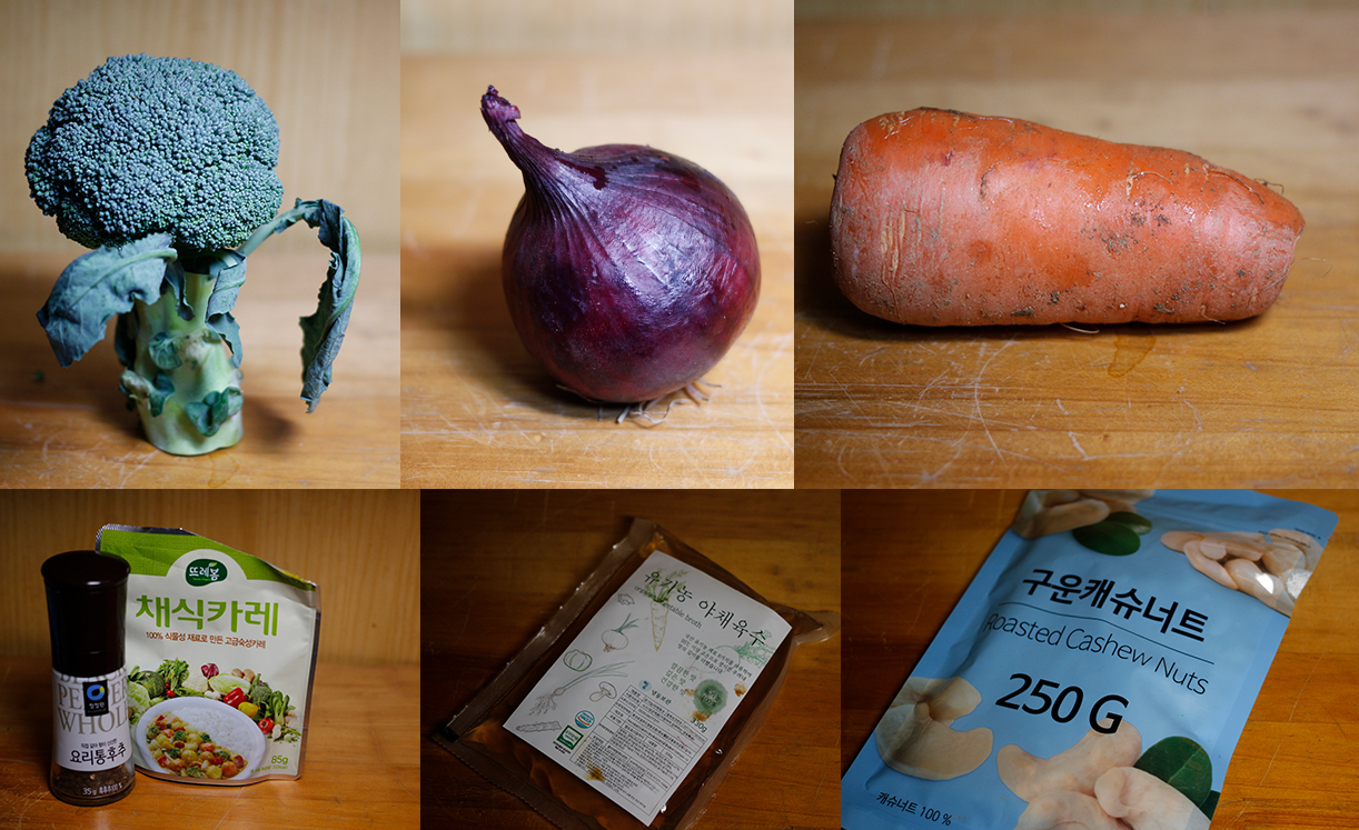 재료는 브로콜리, 당근, 양파, 캐슈넛, 채수, 강황, 소금, 후추, 올리브유가 전부다. 채수는 요리를 하면서 잘려지는 브로콜리의 중간 부분이나 양파 껍질, 당근의 윗부분을 사용해서 만들어도 되는데, 나는 귀찮아서 그냥 인터넷에서 샀다. 마트에 가면 치킨스톡이나 멸치가 들어있는 육수 팩 상품은 많이 나와있는데, 채수를 만들 수 있는 큐브나 팩은 인터넷으로만 살 수 있다는 것이 조금 불편하다. 나도 쉽게 요리를 하고 싶다. 강황 가루는 따로 사기 귀찮아서 11월 요리인 고구마 오픈 샌드위치를 만들 때 사용했던 채식카레가루를 사용했다.