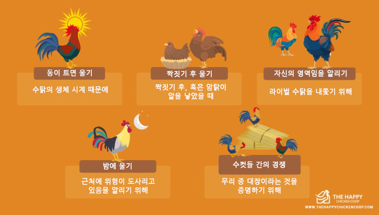 이 외에도 수탉이 우는 이유에 대한 다양한 주장들이 있다. ‘이곳은 내 구역이야!’라는 것을 알리기 위해서, ‘암탉이 알을 낳았어!’, 그리고 또 다른 유력한 주장은 닭의 생체 시계가 작동하기 때문이라는 것.