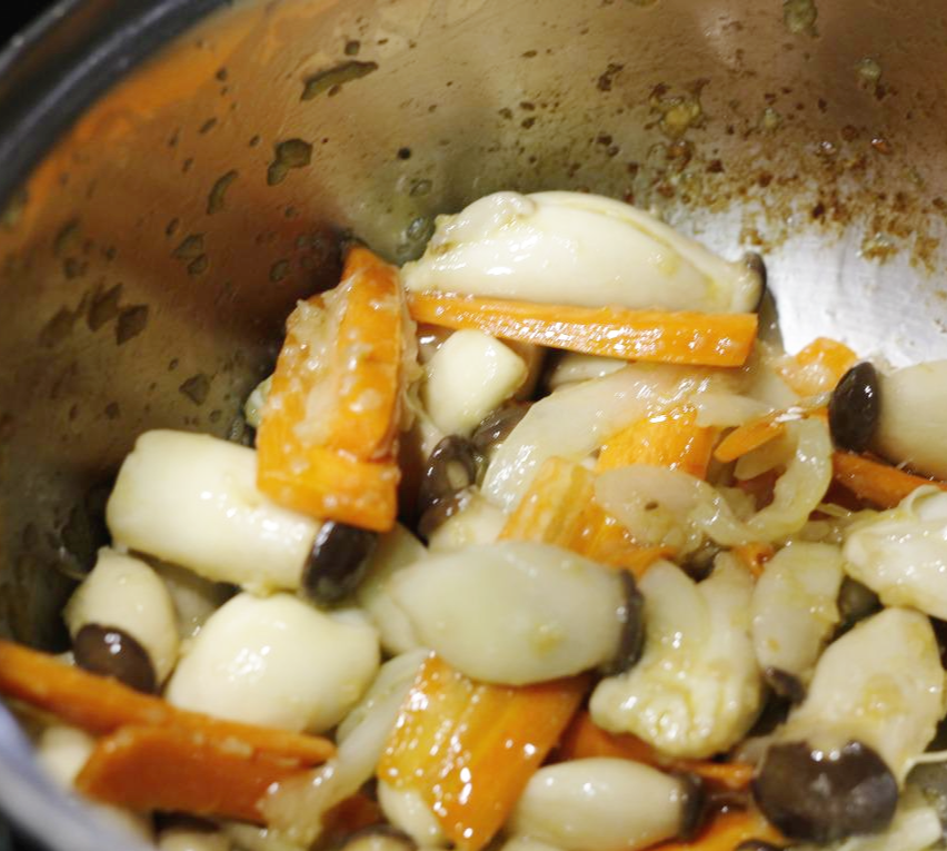 야채를 다 잘랐다면 냄비에 기름을 두르고 야채를 볶기 시작한다. 야채를 넣는 순서는 양파 > 당근 > 버섯을 추천하지만 굳이 지킬 필요는 없다. 양파를 볶을 때 다진 마늘을 함께 넣어도 되지만 시중에서 파는 소스를 사용한다면 이미 소스에 충분한 양의 마늘이 들어있으므로 굳이 넣을 필요는 없다. 버섯의 경우 오래 볶을수록 수분이 날아가 고기와 비슷한 식감을 가지게 되는데 시간이 없거나 귀찮거나 고기와 비슷한 식감의 버섯을 먹기 싫다면 조금만 볶아도 된다.