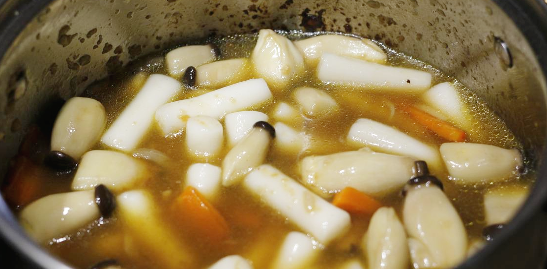 야채가 어느 정도 익었다면 떡을 투입하고 소스를 붓는다. 소스의 양은 너무 많이 넣지 말고 적당히 넣길 바란다. 색깔이 연하다고 소스를 너무 많이 투입하면 엄청나게 짠 간장 떡볶이를 먹게 된다.