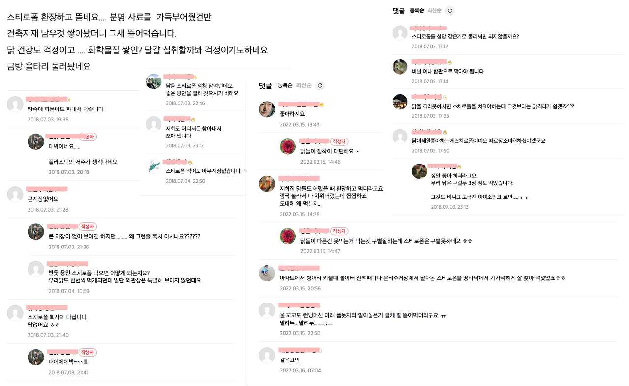 우리 집 닭들 외에 다른 닭들도 마찬가지로 스티로폼을 좋아하는지 궁금했다. 국내외 여러 온라인 커뮤니티를 둘러보았다.