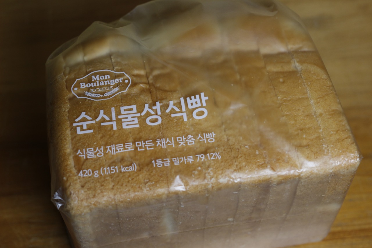 아빠가 집 앞에 있는 홈플러스에서 사온 순식물성 식빵이다. 2-3년 전만 하더라도 식빵을 비건으로 구하려면 정말 어려웠는데, 이제 홈플러스 같은 마트에서도 식빵을 비건으로 판매하는 시대가 되었다. 재료 찾기 어려워서, 비싸서라는 이유로 비건을 할 수 없다는 핑계를 대는 시대는 지나갔다는 이 말이다.