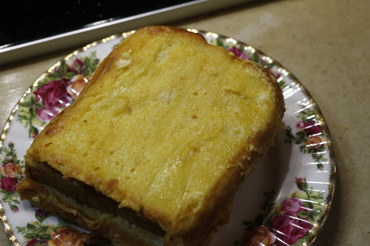 맛있게 잘려진 몬테크리스토 샌드위치다. 집에 딸기잼이 없어서 바르지는 않았는데 원래 레시피대로 빵에 딸기잼을 발라서 몬테크르스토 샌드위치를 만들었다면 더 맛있는 샌드위치가 되지 않았을까 싶다.